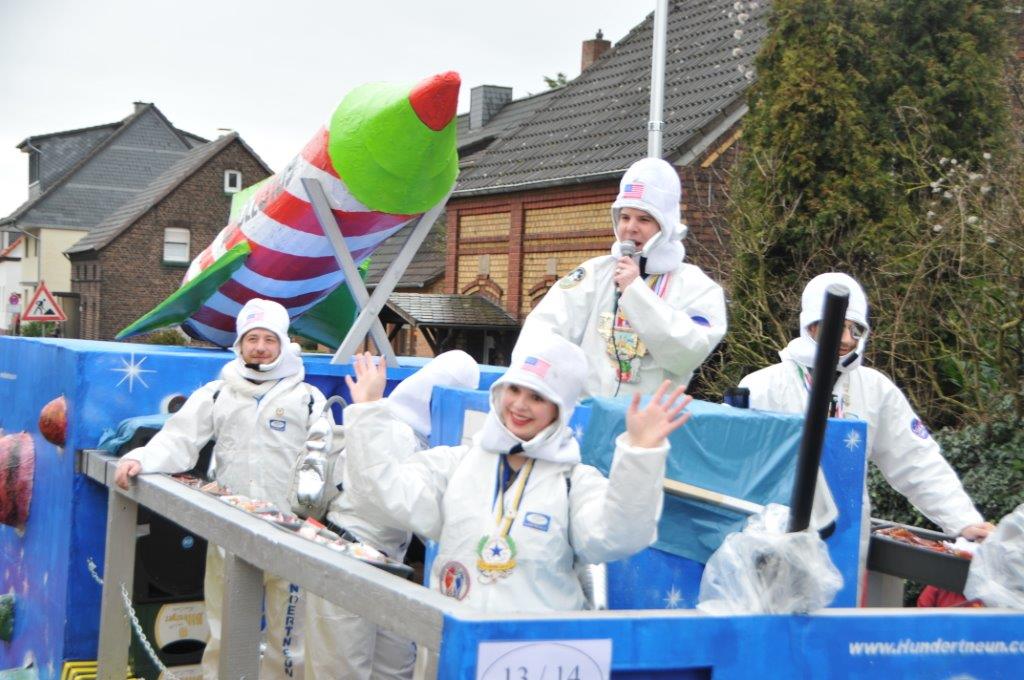 Bei den großen Wagen zeigt sich leider auch diesmal wieder die Tendenz, dass nur noch wenige Baumberger Gruppen einen eigenen, größeren Wagen bauen und diesen vom Motiv her in einen Zusammenhang mit ihrer Fußgruppe stellen. Irgendwie schade, aber auch schwer zu ändern, heißt das doch: Zusätzliche Arbeit und natürlich auch: zusätzliches Geld für Bau-Materialien und Wurfmaterial. Besonders erfreulich, auch in diesem Jahr dabei: Die 109er Action Crew, eine riesig besetzte Truppe mit ihren Raumanzügen und ihrer Riesen-Kanone auf dem toll bemalten Wagen, ja und, natürlich mit ihrem Ober-Raumfahrer Andek Beginn.