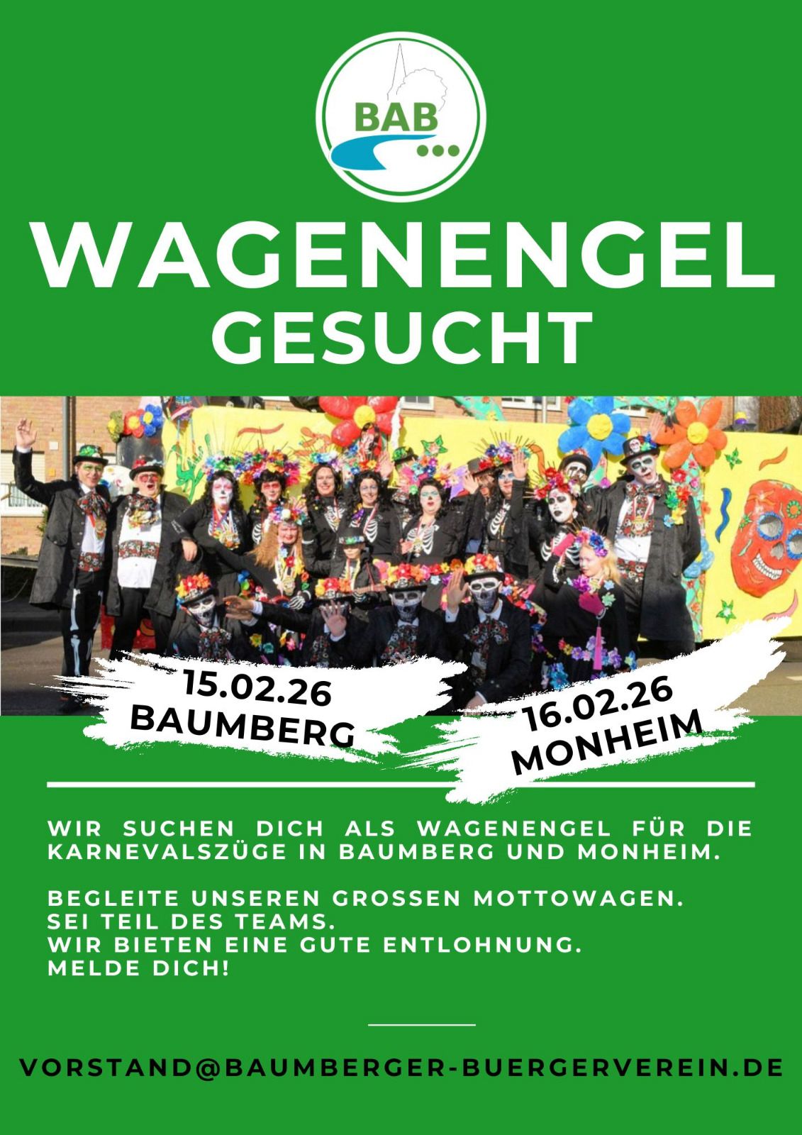 Wir suchen Wagenengel, die unseren Karnevalswagen beim Baumberger Veedelszoch am Tulpensonntag und beim Monheimer Rosenmontagszug begleiten. Bei Interesse oder für nähere Infos melden Sie auch bitte per Mail an